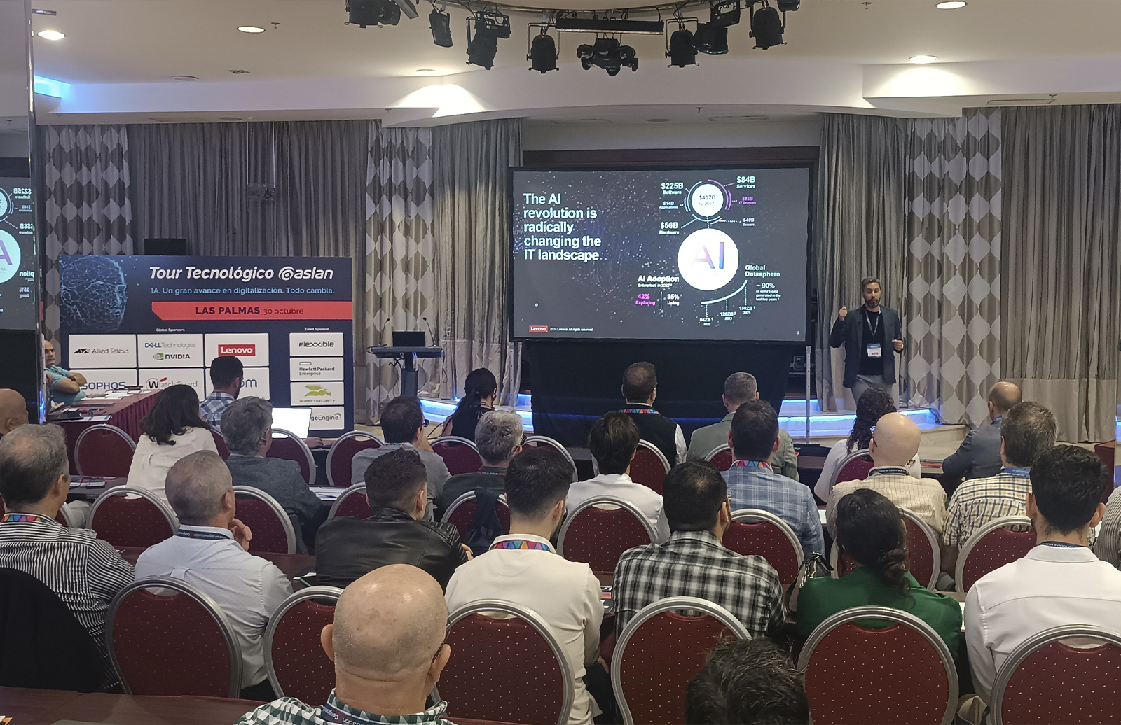 Esta XVIII edición del Tour Tecnológico @aslan se celebra bajo el título «IA. Un gran avance en digitalización. Todo cambia» y pondrá el foco en la aplicación de esta tecnología transformadora llamada a ampliar nuestras capacidades en los ámbitos de la ciberseguridad y ciberresiliencia, el puesto de trabajo digital, las redes inteligentes o las infraestructuras híbridas.